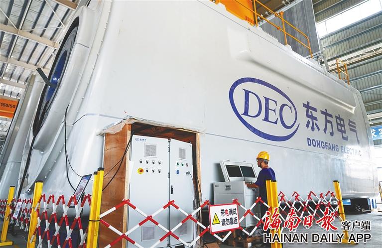 在海南洋浦海上风电产业园一期厂房,工程人员正调试风机主机。海南日报全媒体记者 陈元才 摄