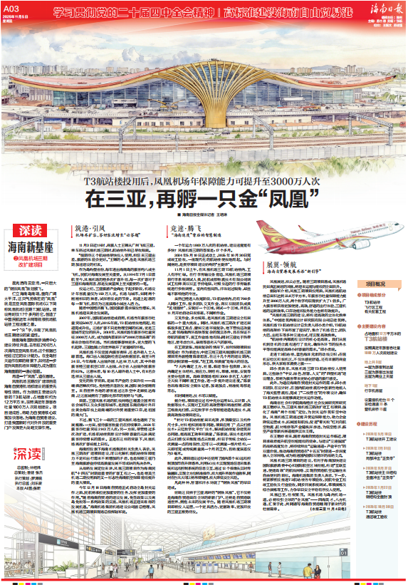 凤凰机场三期改扩建项目是海南自贸港机场群建设的重要先导性项目。作为项目主要建设内容的T3航站楼,占地面积约为12万平方米,按照满足年旅客吞吐量1800万人次规划建设。项目建成后,将助力自贸港核心政策加快落地,为海南自贸港建设、打造我国新时代对外开放的重要门户发挥更大战略支撑作用。