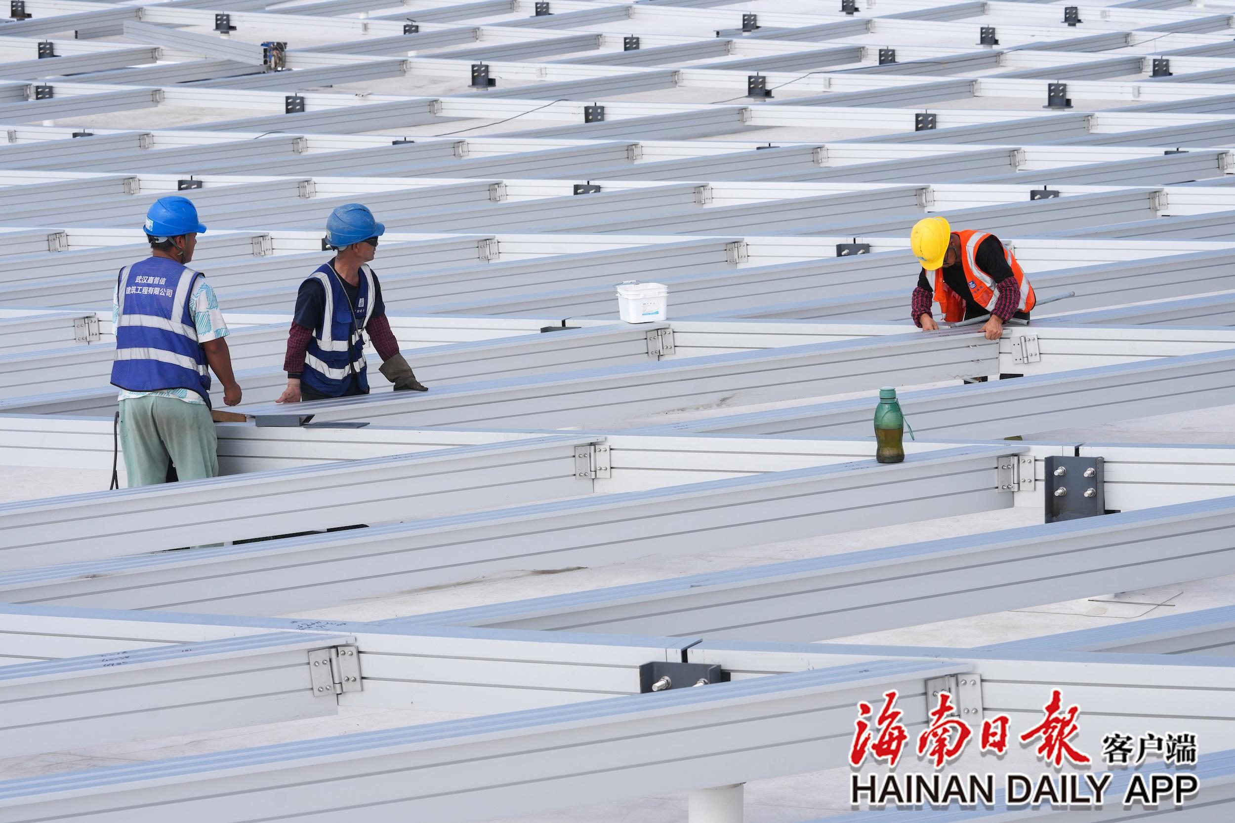 三亚凤凰国际机场三期改扩建项目施工现场,工人们在屋面安装装饰层龙骨。海南日报全媒体记者 王程龙 摄