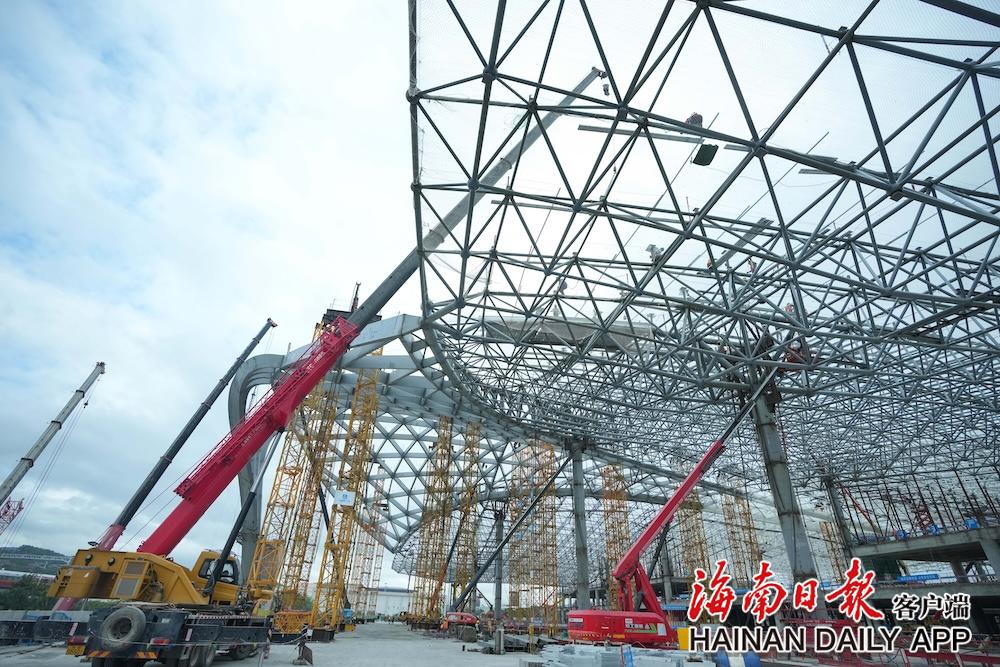 “7天内确定土方、桩基、临建等分包资源,30天内确定主体结构、预应力、钢结构、幕墙、精装、安装等主要分包资源。高峰期现场组织2000余名工人进行全天候不间断施工作业,进一步提升建设速度。”陈豪告诉海南日报全媒体记者,加班加点、精准统筹都是常态。