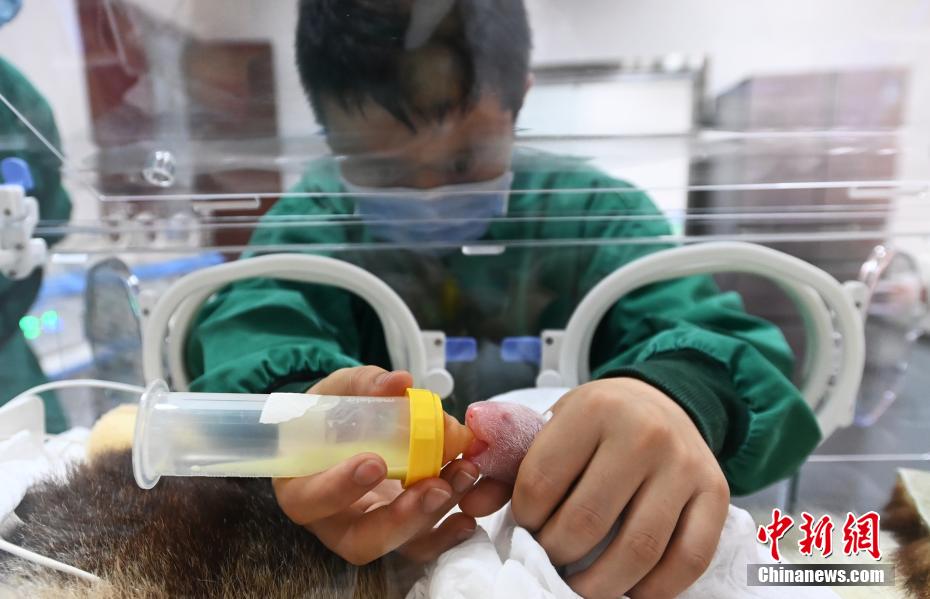 8月4日育幼员在育幼室给大熊猫“宝宝”的二仔喂初乳。安源 摄