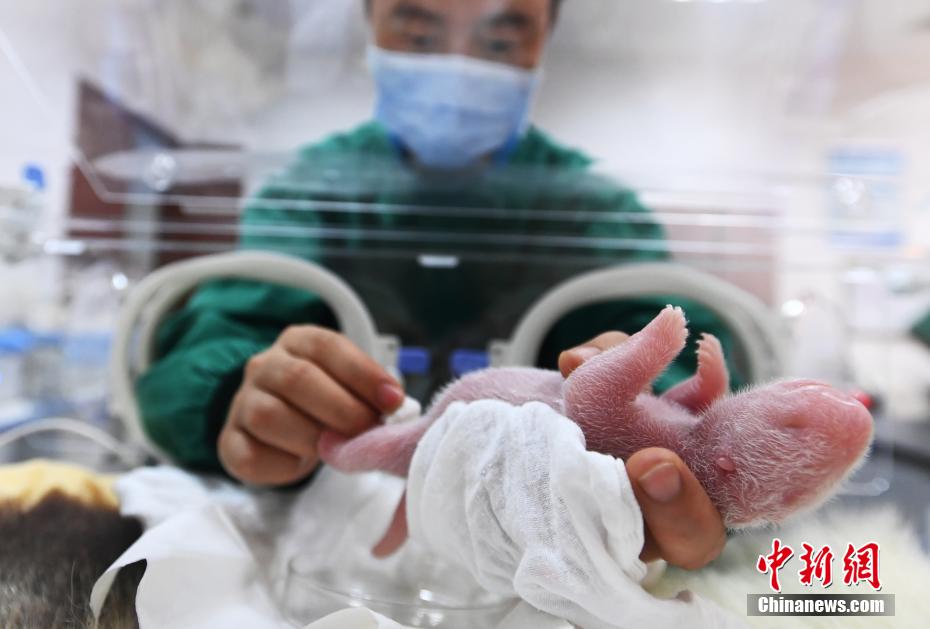 8月4日育幼员在育幼室给大熊猫“宝宝”的二仔处理脐带。安源 摄