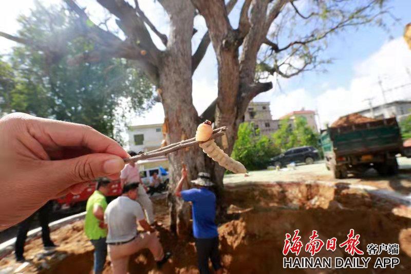 从古树根部腐烂部位掏出来的天牛幼虫。