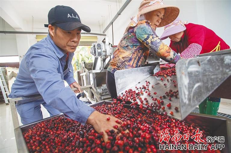 在万宁兴隆的中国热科院香饮所万宁高龙基地,工人正在加工咖啡果。 海南日报记者 袁琛 摄