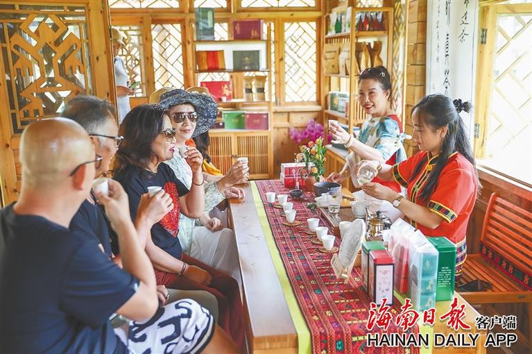 日前,游客在五指山市水满乡毛纳村品茶。 海南日报记者 李天平 摄