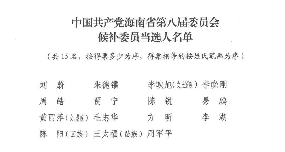 中国共产党海南省第八届委员会候补委员当选人名单