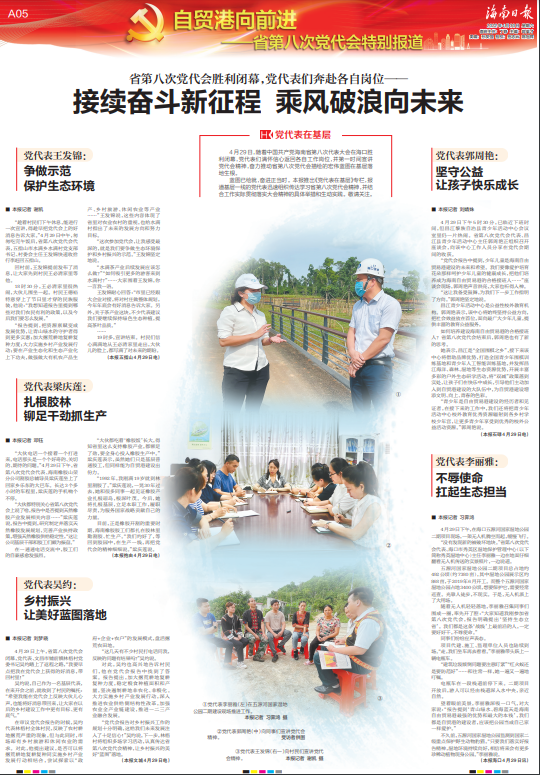 4月29日,随着中国共产党海南省第八次代表大会在海口胜利闭幕,党代表们满怀信心返回各自工作岗位,并第一时间宣讲党代会精神,奋力推动省第八次党代会描绘的宏伟蓝图在基层落地生根。