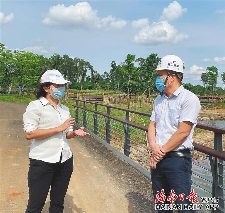 党代表李丽雅(左)在五源河国家湿地公园二期建设现场推进工作。 本报记者 习霁鸿 摄