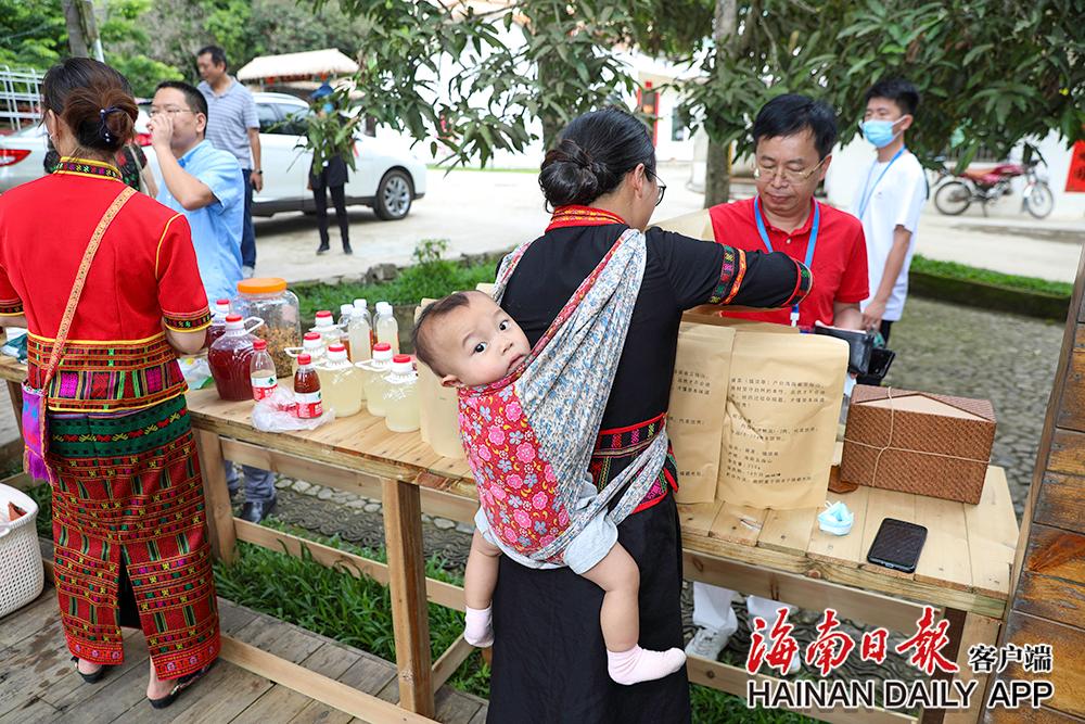 5月18日,在五指山水满乡毛纳村,村民背着孩子销售特色产品。海南日报记者 李天平 摄