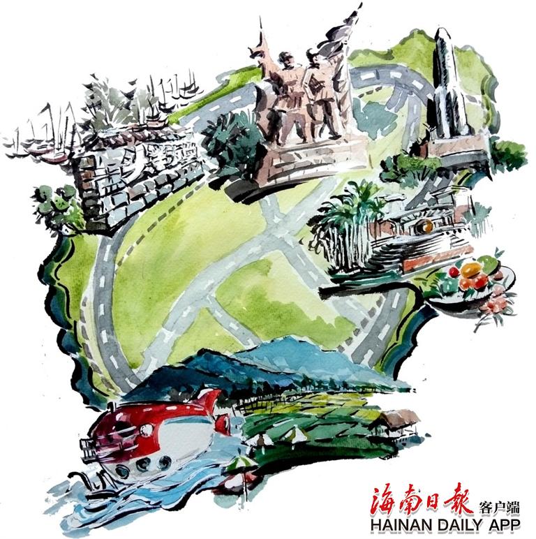 “筑梦大道和环岛专列研学之旅”水彩插画。吴源 绘