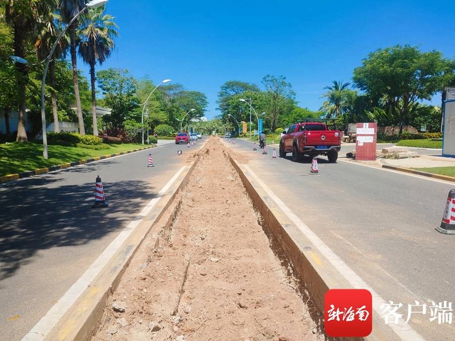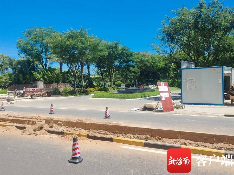 路边一块工程告示牌显示,该工程为海公馆一期门前道路优化改造,施工长度165米,建设单位为海南中海地产。