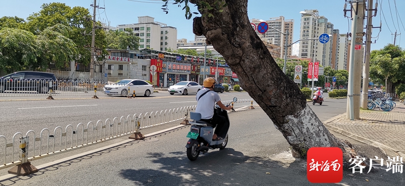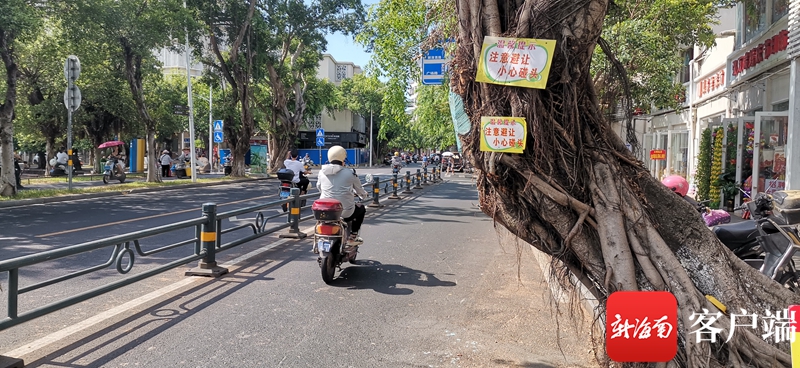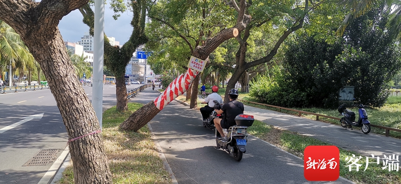 除了博爱南路,记者在大同路靠近海口人民公园公交站旁的非机动车道上,也看到有类似的“歪脖子”树,不过歪到路面的部分枝干已经被修剪,也挂有安全提示牌。