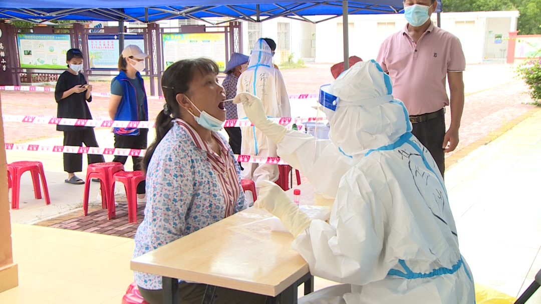 8月11日下午一点半,在罗带小学核酸采样点,村民间隔约1米,有序排队,等待着核酸检测。身着“大白”的医护人员争分夺秒进行采样工作,整个过程迅速规范。遇到不配合的小朋友以及行动不便的老人,医护人员贴心采取或站、或弯腰的姿势为村民进行采样。被汗水浸透的衣物,被口罩勒出印痕的脸庞,都成了她们的“标配”。