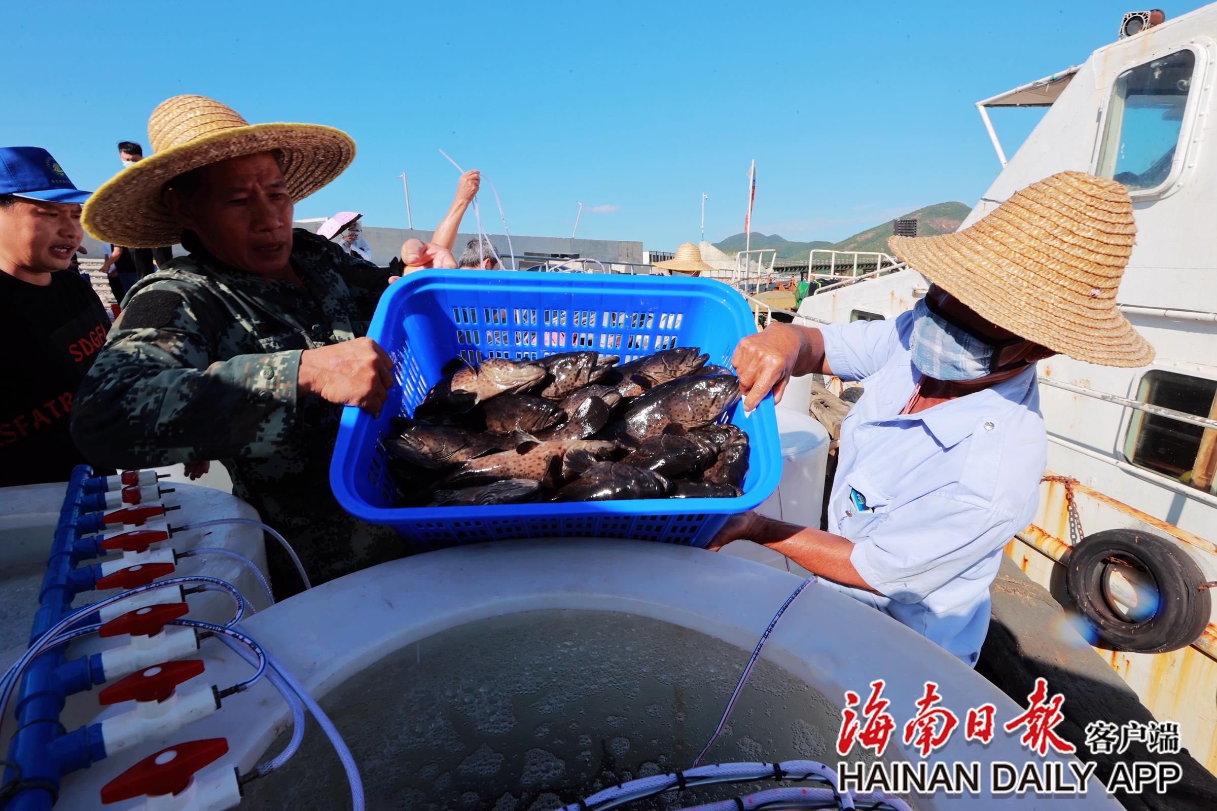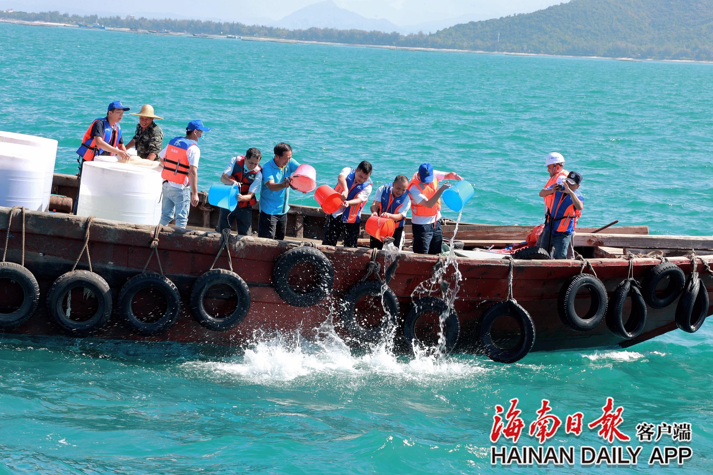 11月16日,三亚,天朗气清。在红塘湾莲花岛码头,3辆卡车并列停放,“一二、一二……”十余名工人齐心协力,将一筐筐活蹦乱跳的鱼儿从车厢搬上渔船,它们即将游往“新家”。