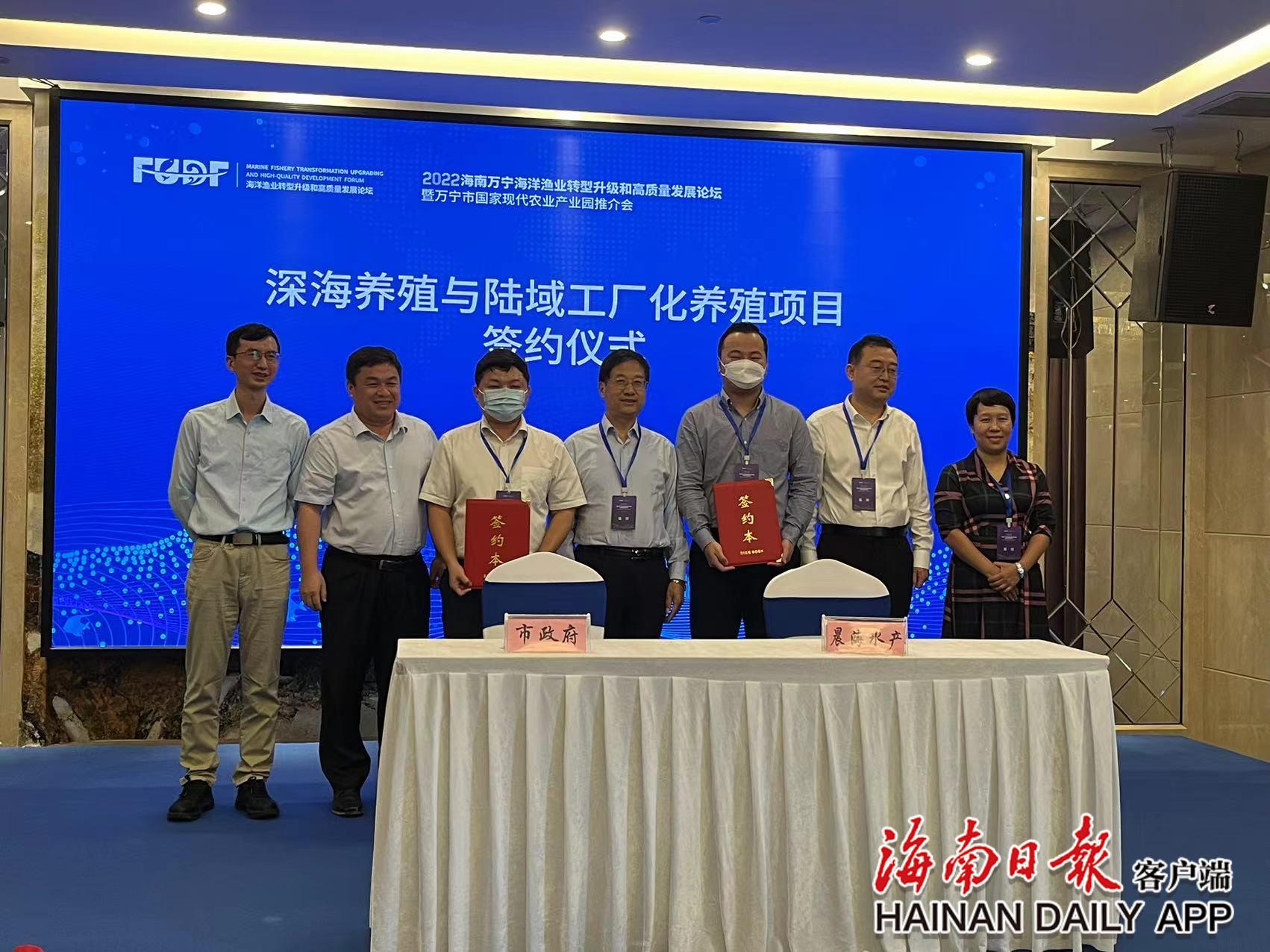 11月19日的推介会上,海南晨海水产有限公司等四家企业与万宁市政府签投资建设协议书,进驻万宁市现代农业产业园发展智能生态渔场等项目。据万宁市副市长郑忠发介绍,目前,结合产业园规划目标和现有产业基础,万宁市正重点推进万宁市工厂化养殖产业园项目(一期)、海水种苗选育实验基地项目、万宁渔业智能化管理系统项目、水质在线监测项目、精品休闲渔业示范工程项目和万宁优质水产品牌建设项目6个项目。