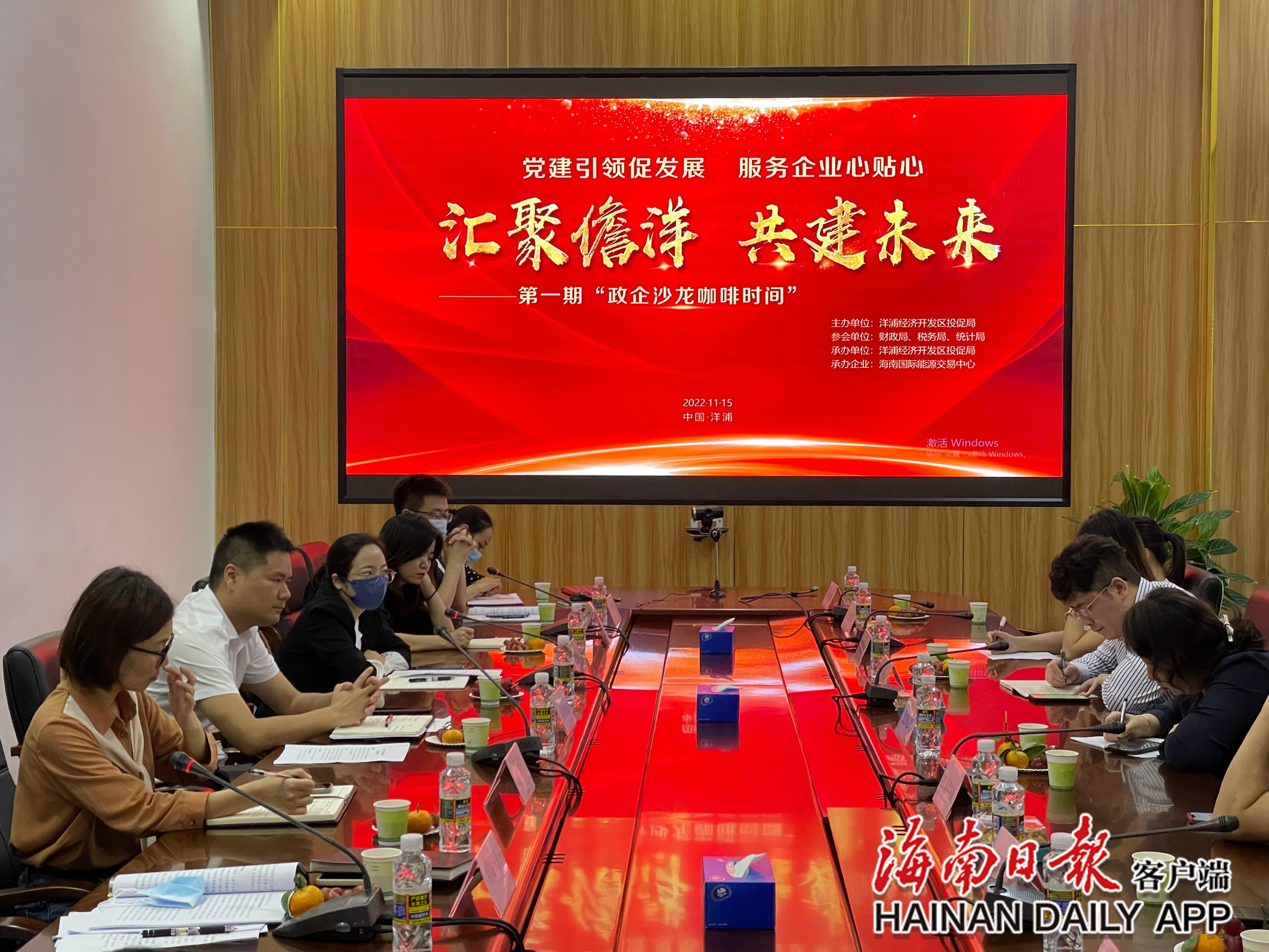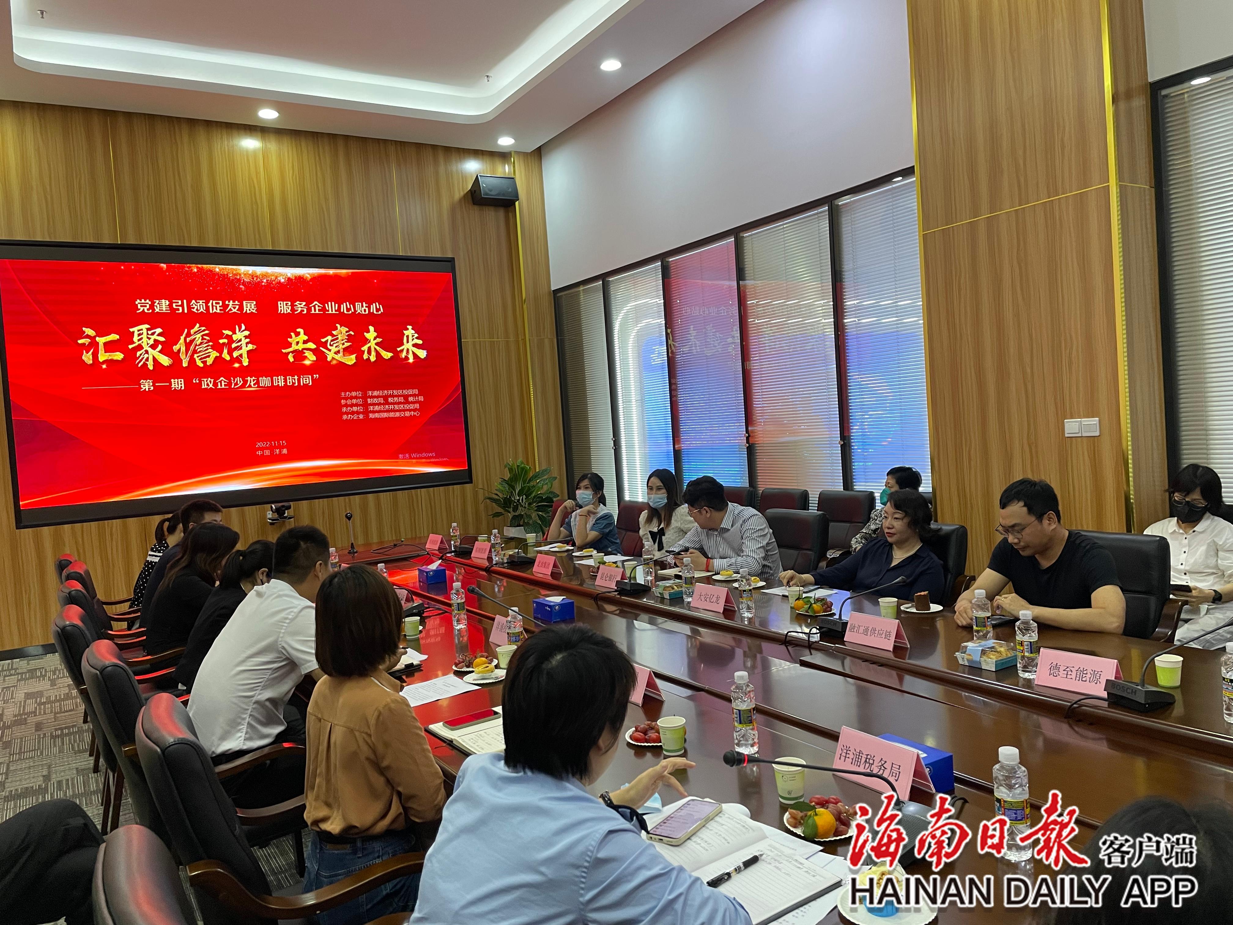 当天下午3时,海南国际能源交易中心一楼会议室,咖啡芬芳扑鼻,20余家企业齐聚一堂,和儋州洋浦投资促进局、财政局、税务局、统计局等单位面对面交流,寻找投资机遇。