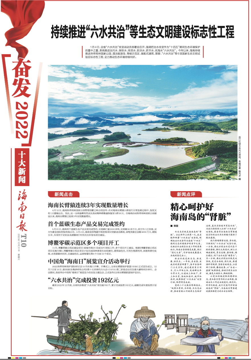 水生态系统是海南岛的“肾脏”。2022新年上班第一天,我省随即部署“六水共治”攻坚战,明确把治水攻坚作为海南“十四五”期间生态环境保护的重中之重,反映出水治理在全省工作的重要地位,传递出坚持绿色发展,践行“国之大者”,守护海南发展最大本钱的坚定决心。