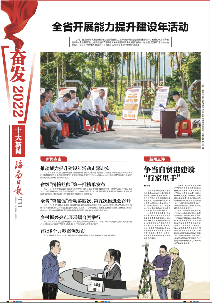 2月7日,全省作风整顿建设年活动总结暨能力提升建设年活动动员部署会召开。省委也于此前印发《关于在全省开展“能力提升建设年”活动的实施方案》《关于深化拓展“查堵点、破难题、促发展”活动的实施方案》。多项工作的推进,持续提升干部队伍服务自贸港建设的能力和水平。