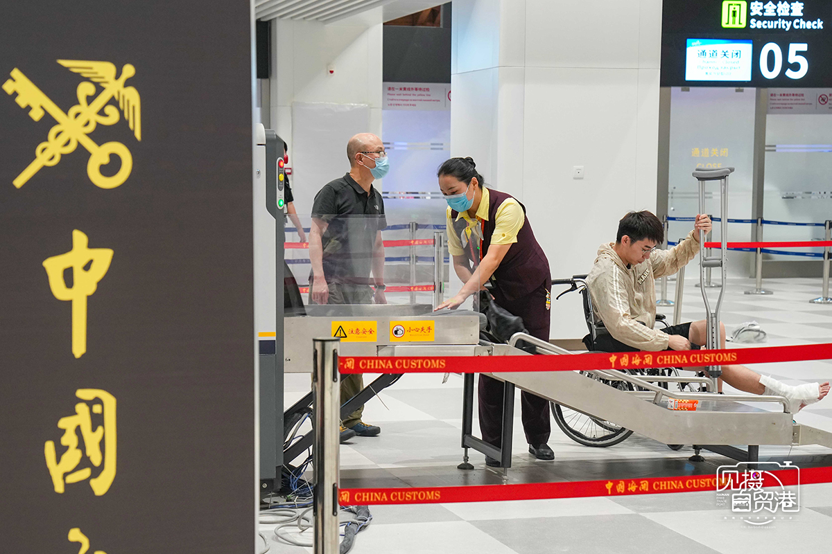 7月1日,在三亚凤凰国际机场国际航站楼,机场工作人员帮受伤旅客搬运行李。海南日报记者 王程龙 摄