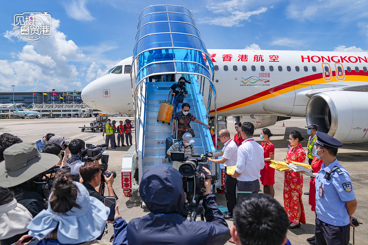 7月1日,HX161“三亚⇌香港”航班飞抵三亚凤凰国际机场,工作人员举办仪式迎接来自香港的旅客。海南日报记者 王程龙 摄
