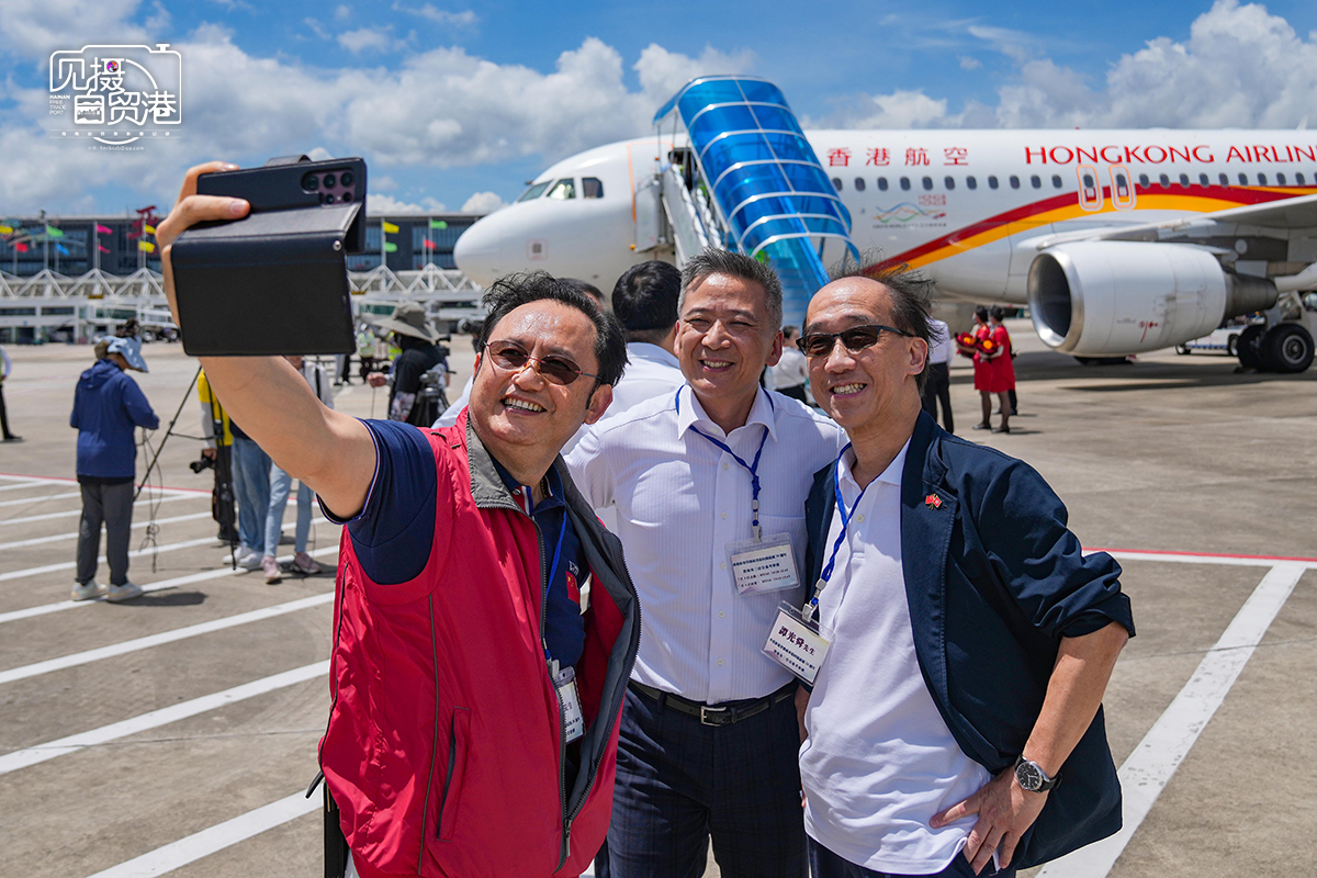 7月1日,乘坐HX161“三亚⇌香港”航班的旅客,飞抵三亚凤凰国际机场后开心合影。海南日报记者 王程龙 摄