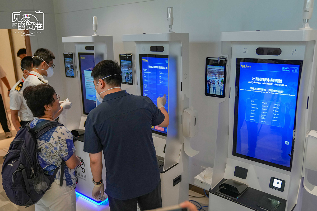 7月1日,在三亚凤凰国际机场国际航站楼,前往香港的旅客在海关工作人员的指引下完成出境健康申报核验。海南日报记者 王程龙 摄