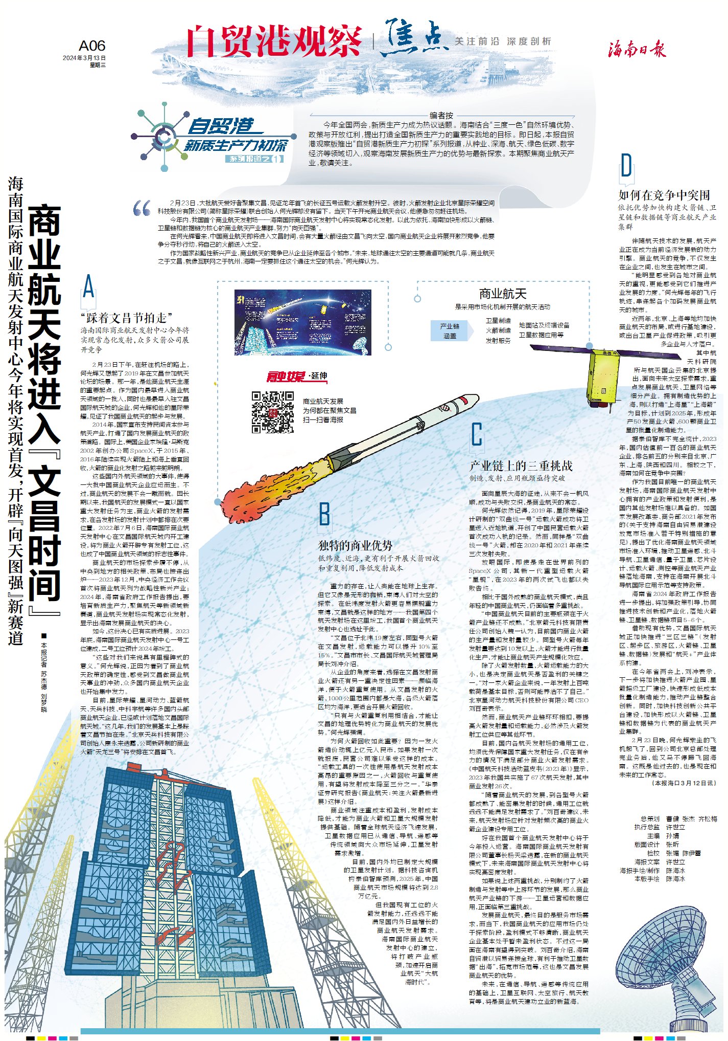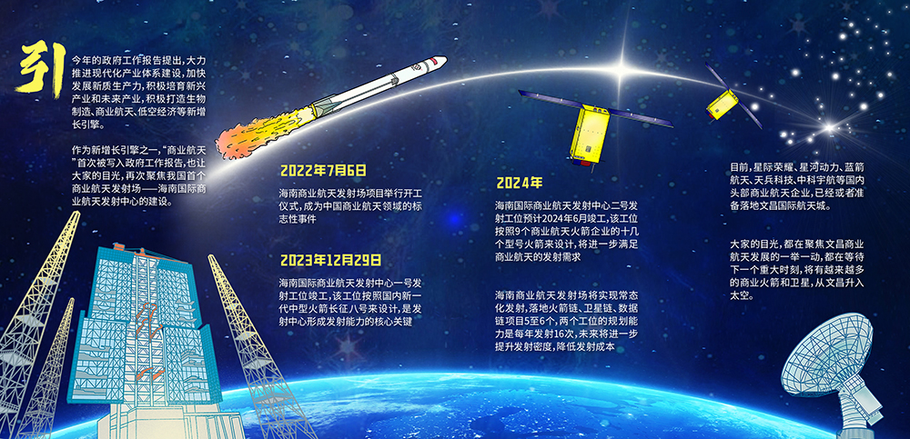 商业航天的市场探索步履不停,从中央到地方的相关政策、布局也接连出炉——2023年12月,中央经济工作会议首次将商业航天列为战略性新兴产业;2024年,海南省政府工作报告提出,要培育新质生产力,聚焦航天等新领域新赛道,商业航天发射场实现常态化发射,显示出海南发展商业航天的决心。