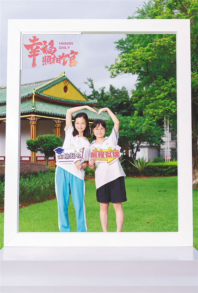 两名学子分别拿着“金榜题名”“前程似锦”手举牌拍照留念。海南日报记者 张茂 摄