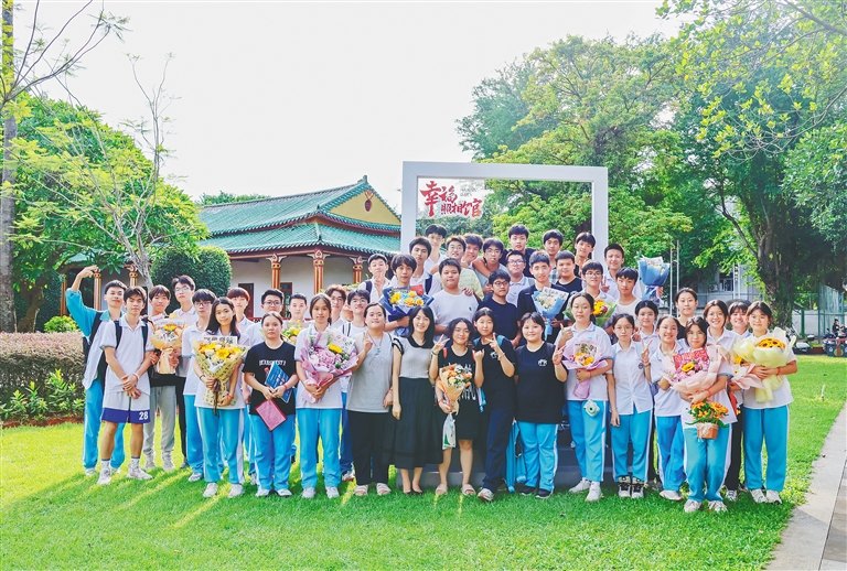 高考结束后,师生在海南中学凤栖堂一侧,留下难忘的青春纪念照。海南日报记者张茂 通讯员邓婷婷 摄