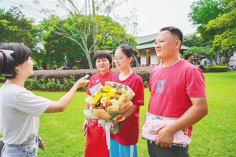 学子手捧鲜花,家长陪伴在侧,这一刻,幸福写在他们脸上。海南日报记者 张茂 摄