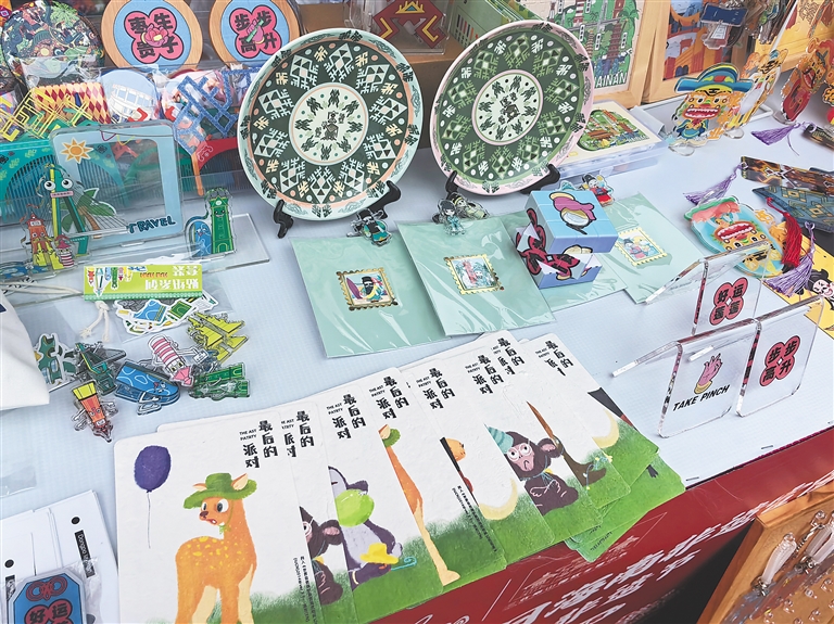 非遗拼图、非遗手机壳、非遗冰箱贴、非遗书签……她的摊位前摆满各式各样的文创产品。和非遗传承人制作的非遗产品不同,这些文创色彩更鲜亮、造型更独特、设计更大胆,有一种年轻人特有的青春气息。