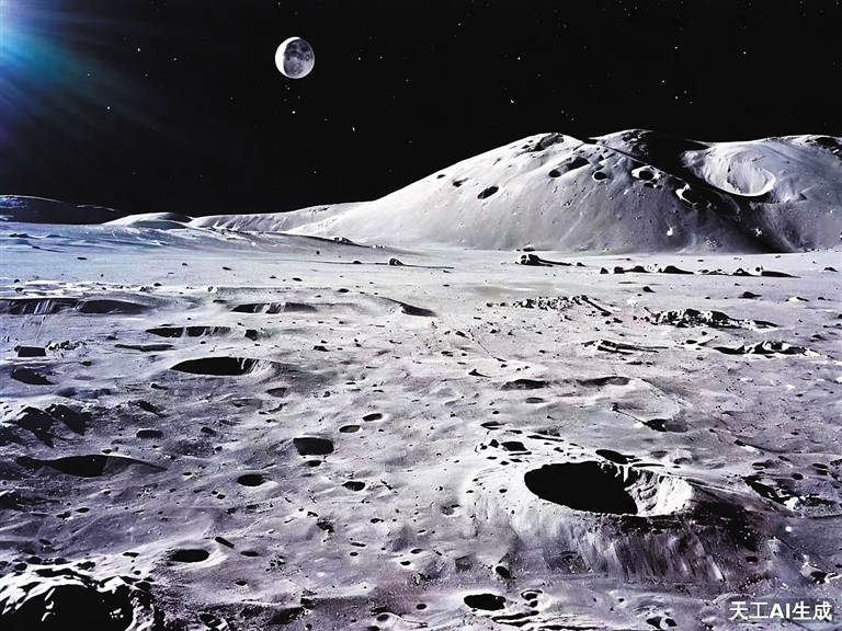 嫦娥六号着陆月球模拟图。(月背图为AI绘制)