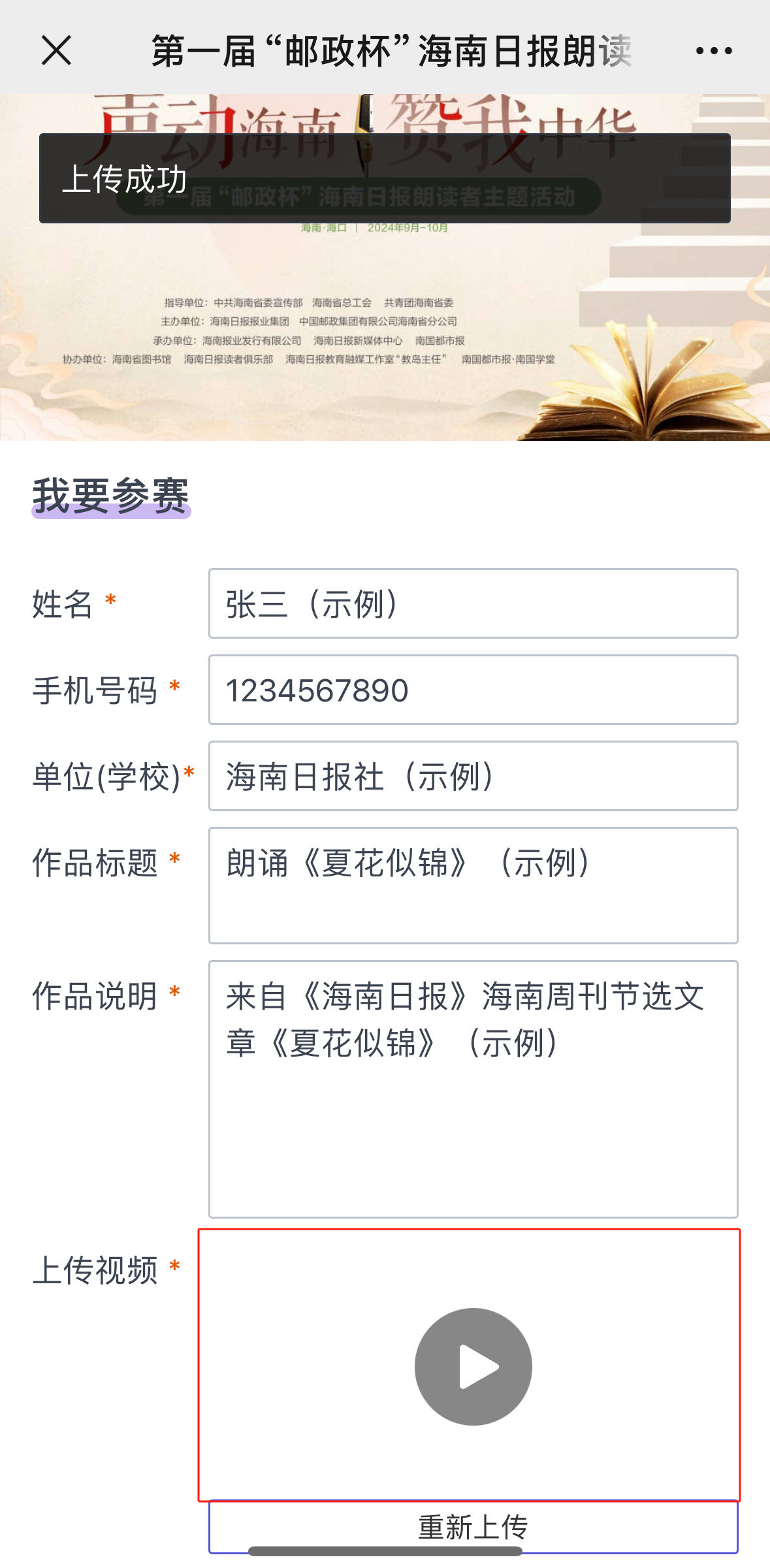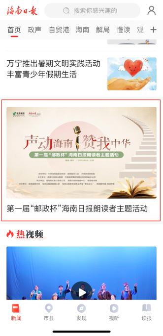 (一)上传时间:请于2024年9月1日至9月22日将视频上传至海南日报客户端第一届“邮政杯”海南日报朗读者主题活动专区。