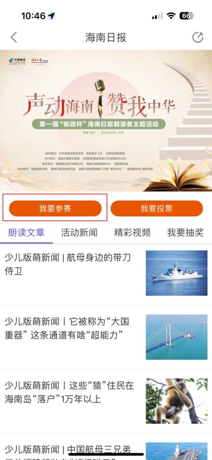 (一)朗读内容为海南日报客户端活动专区中“朗读文章”素材库中选择的文章,或其他自选的相关主题文章,可以节选,但不能添加或修改。