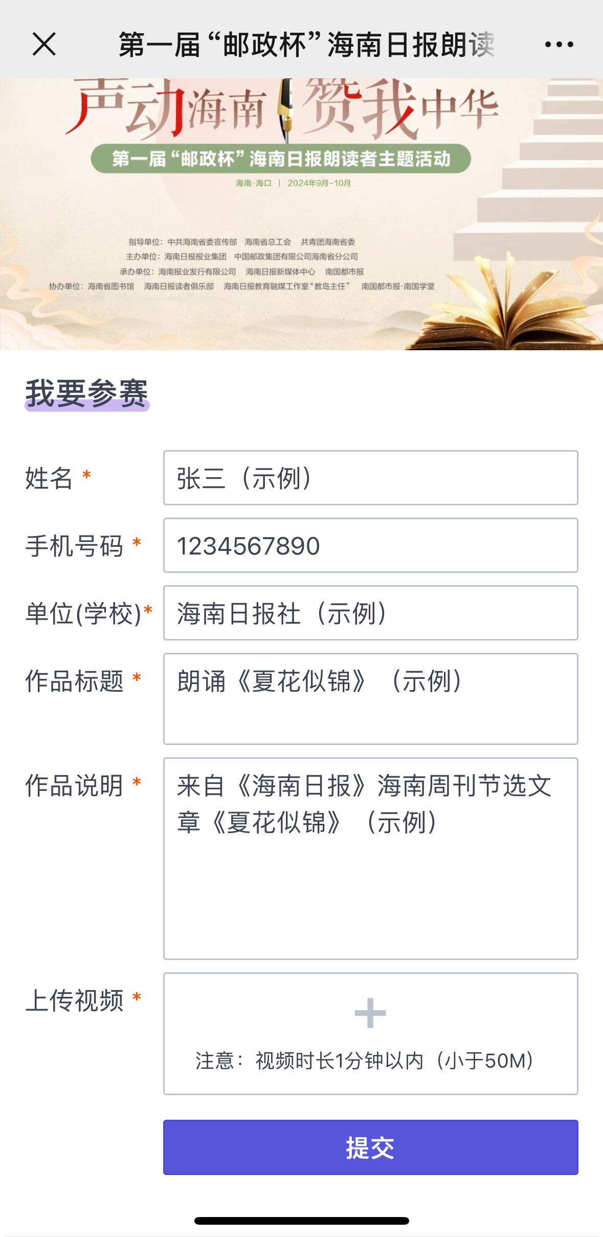 本次活动征集阶段为9月1日-9月22日,参赛人员将1分钟以内、小于50M的素材库中规定朗读文章(节选)或自选文章视频投稿至海南日报客户端活动专区报名即可。