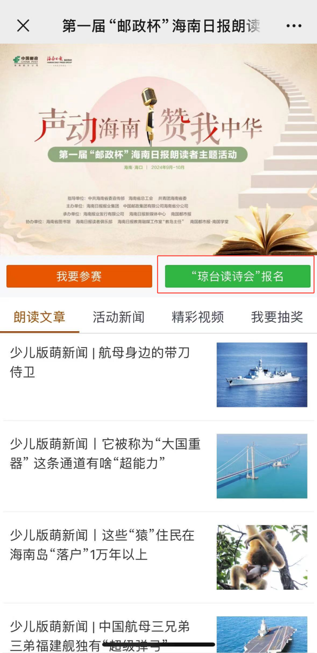 报名方式1:下载海南日报客户端,点击活动专区首页,点击【“琼台读诗会”报名】,按提示输入信息进行报名。