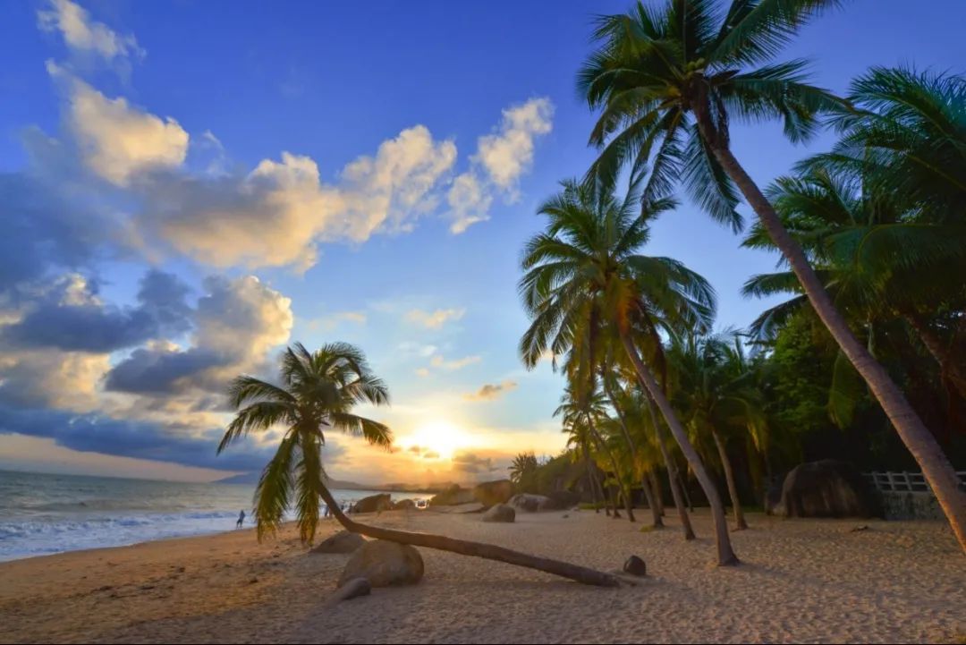 大东海三面环山,一面大海,一排排翠绿椰林环抱沙滩,蓝天、碧海、青山、绿椰、白沙滩独特之美让海内外游客赞叹。大东海沙滩平坦细软,缓缓延伸,长达千米。