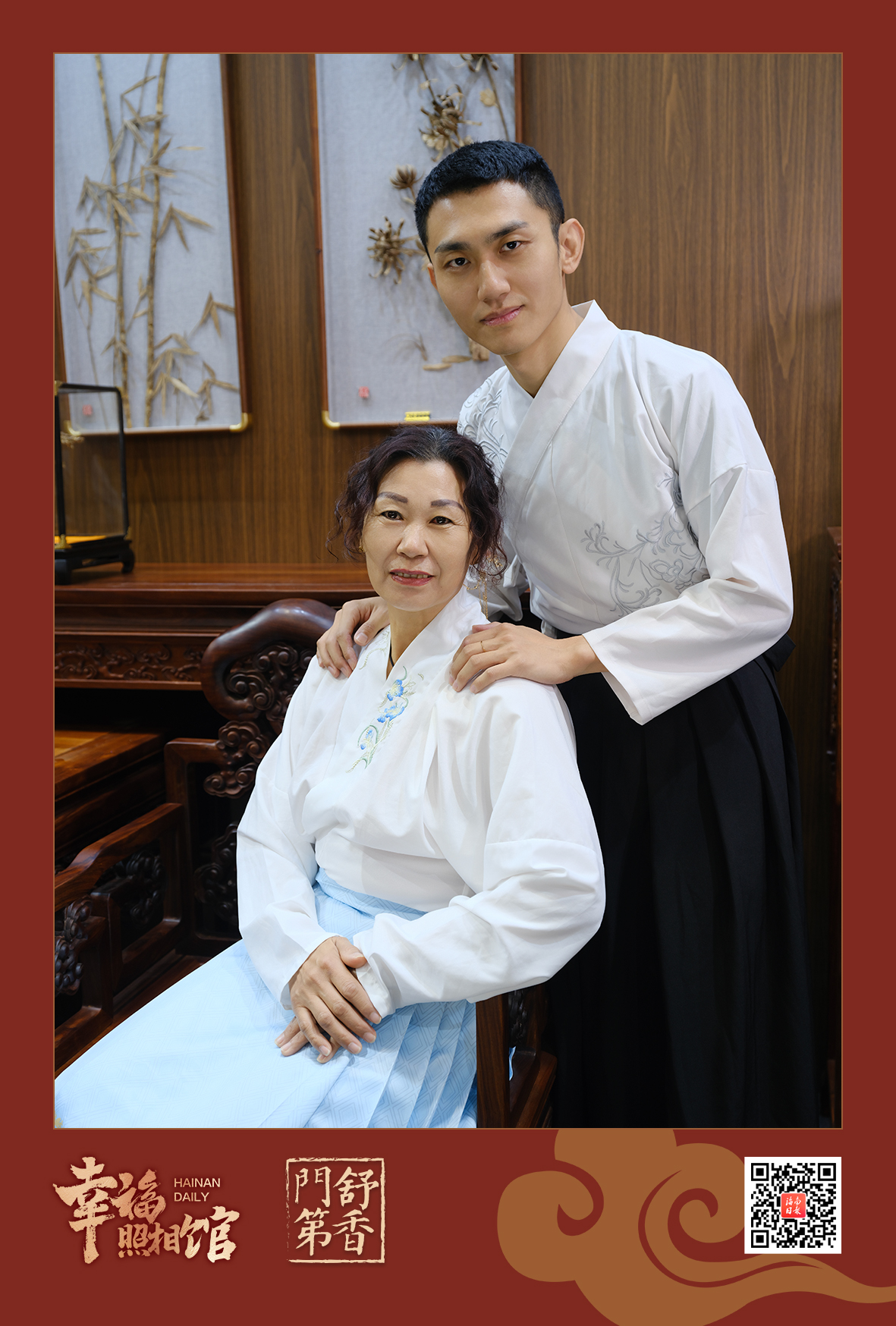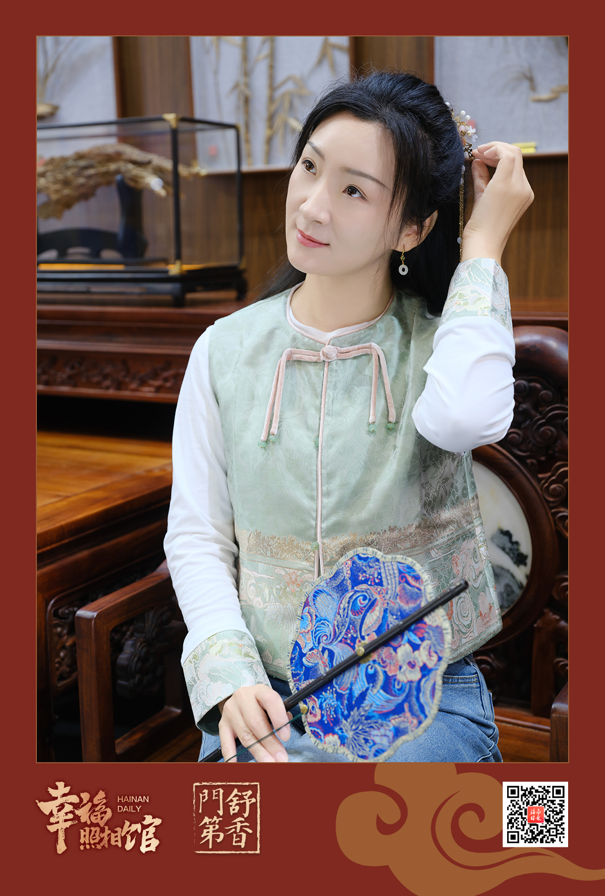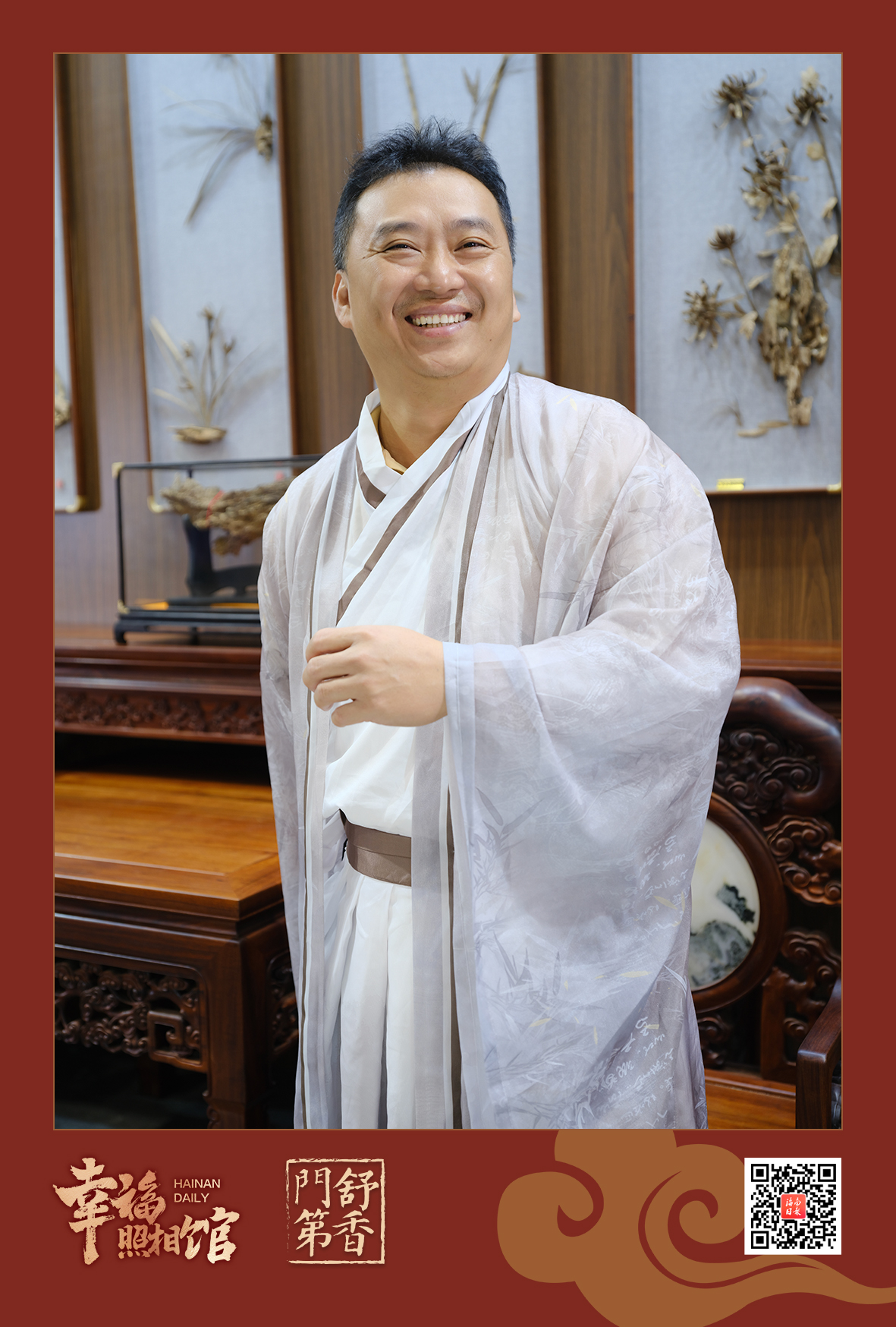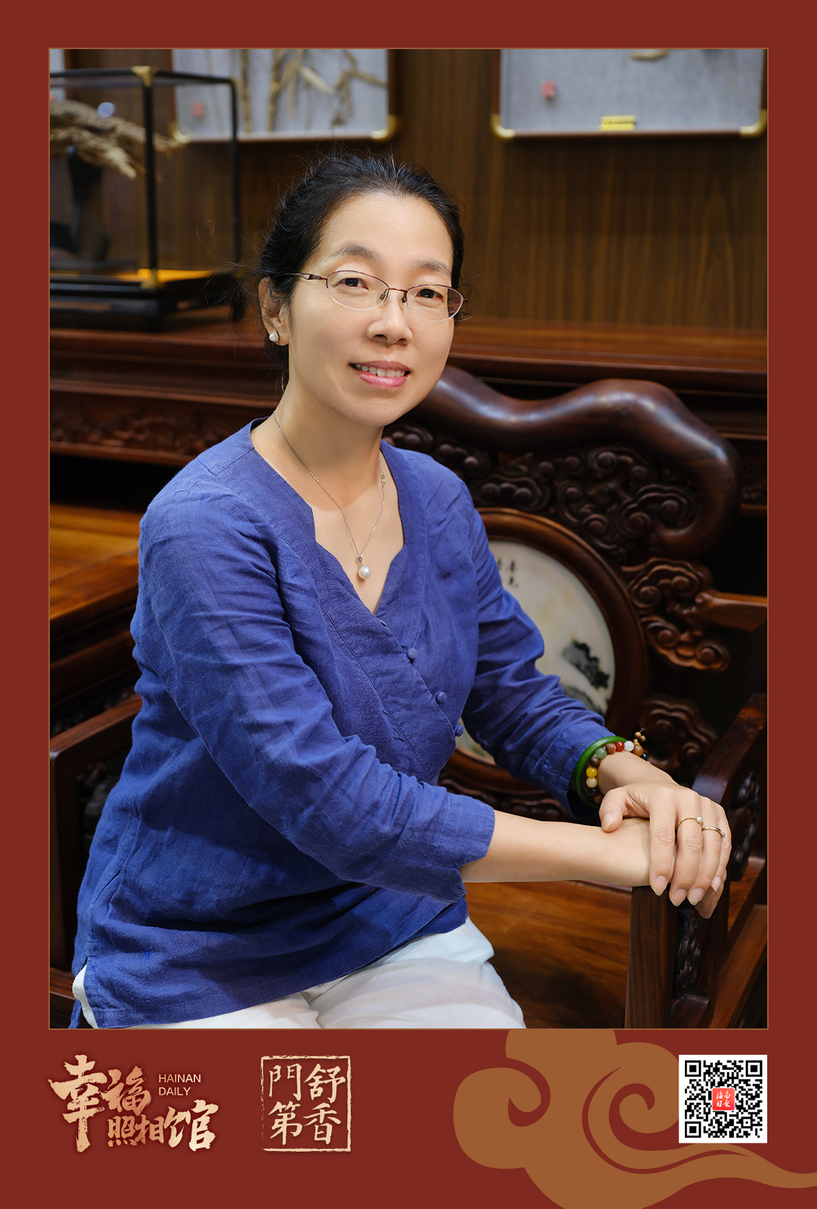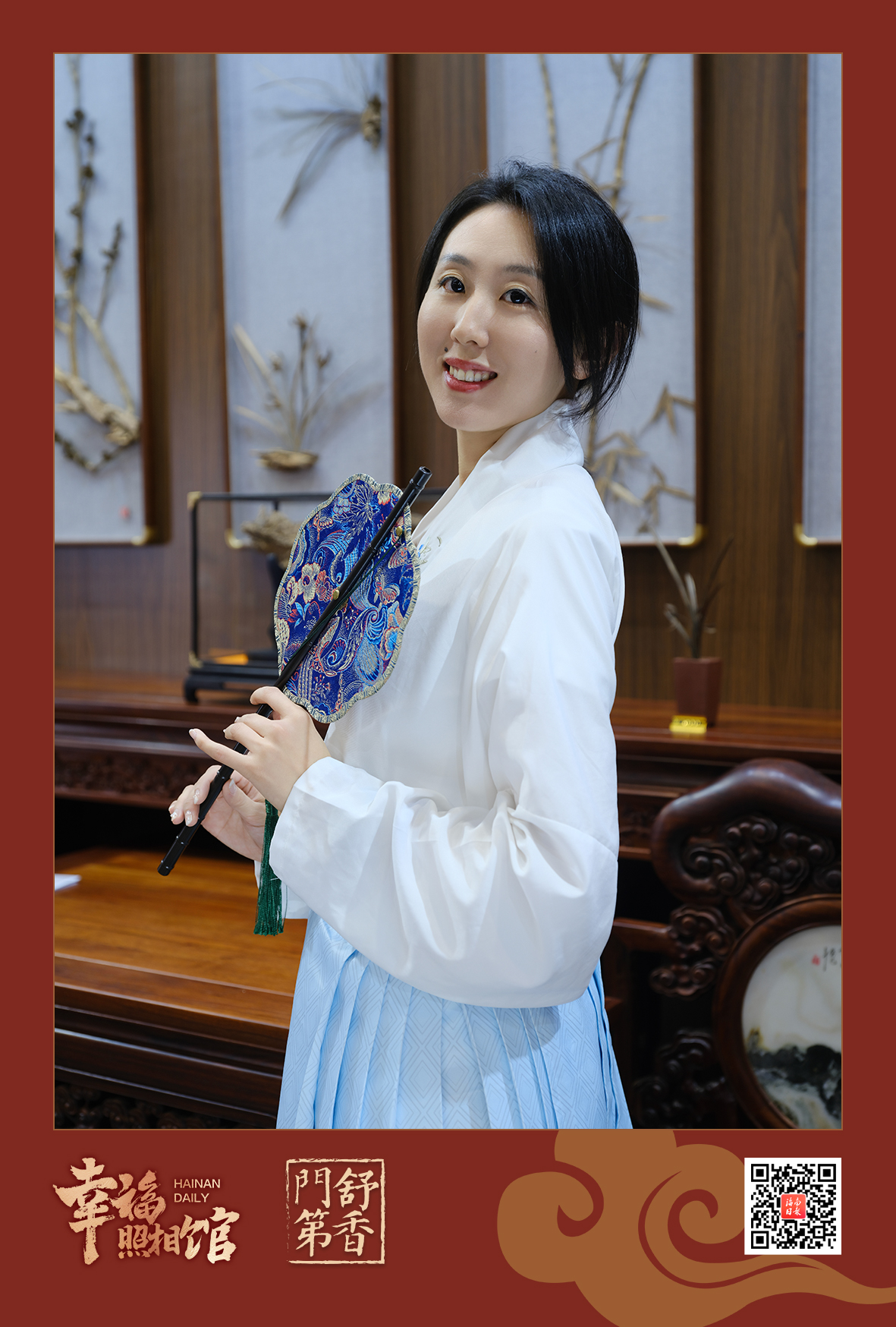 上午9时,海南国际会展中心5号馆内人气爆棚。在场馆中间位置的“舒香门第”展区内,一架屏风围起的一方天地里,摆着一张花梨木椅,聚光灯亮起,“幸福照相馆”闻香阅报打卡站准时“开门营业”,为从四面八方前来参会的朋友们留住美好的记忆。