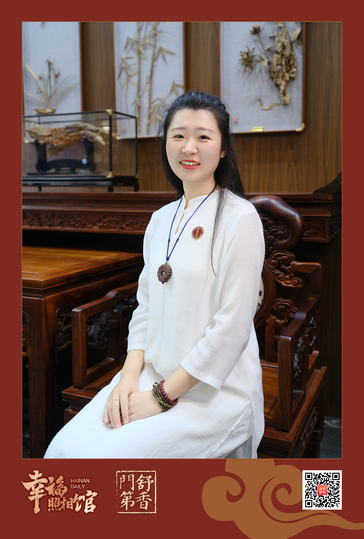 这是一场因名木而相聚的盛宴,大家循“香”而来,在这里结交同好,寻求合作机会。于雅璐所在的公司深耕香业多年,听说海南要开这样的一场大会,作为公司东北营销中心负责人的于雅璐特意带着团队从大连来到海南参会。她的公司不仅带来了用沉香花梨制作的家具和工艺品,还在展区设置了直播间,更有定时的点茶表演,吸引了一波又一波爱好者光临。在午休的间隙,于雅璐换上了马面裙,在“幸福照相馆”留下她忙碌且充实的影像。“我第一时间就报名了!大会能把我们这些种植沉香、生产香产品的同行聚到一起,特别开心。”于雅璐对此次参会充满期待。