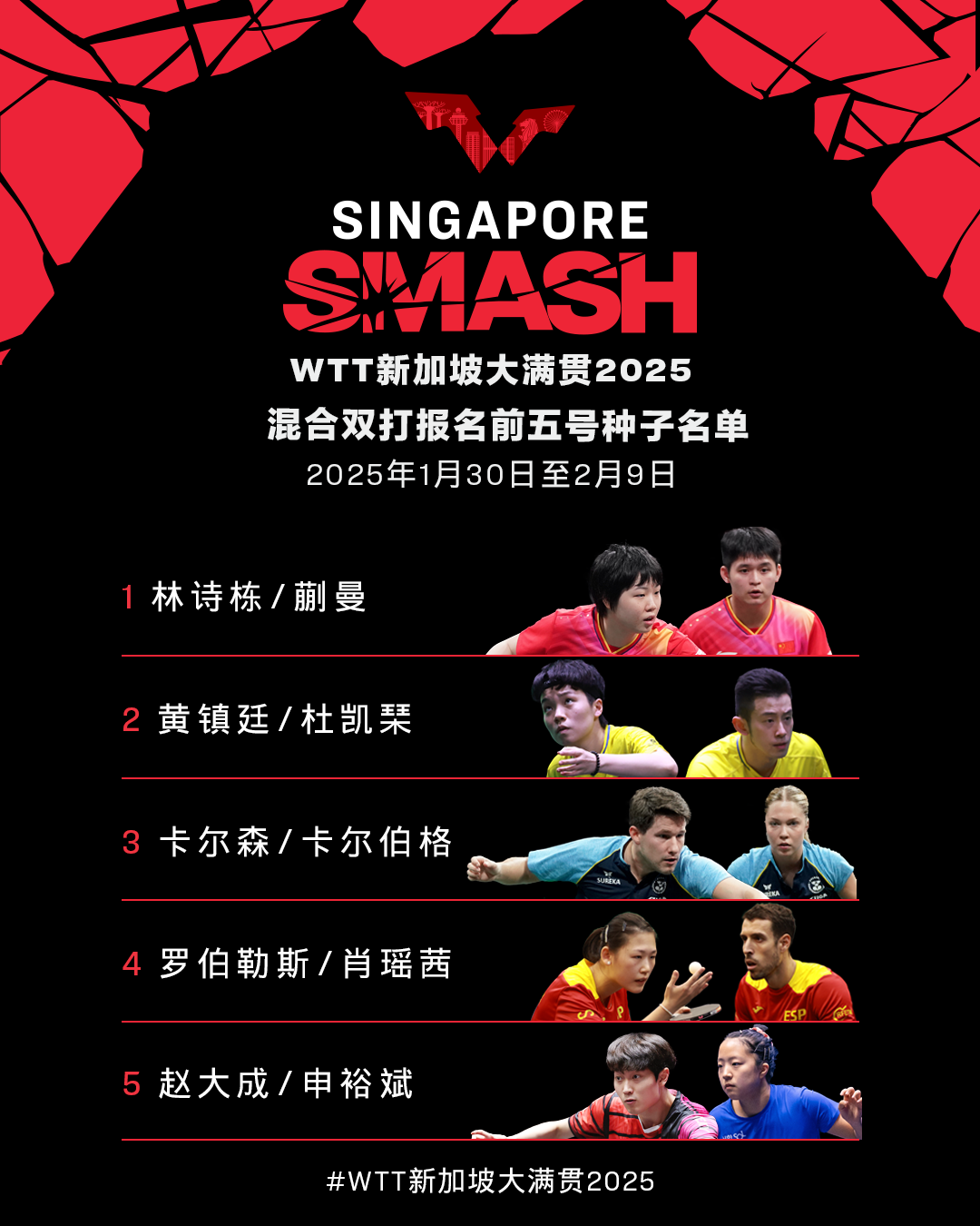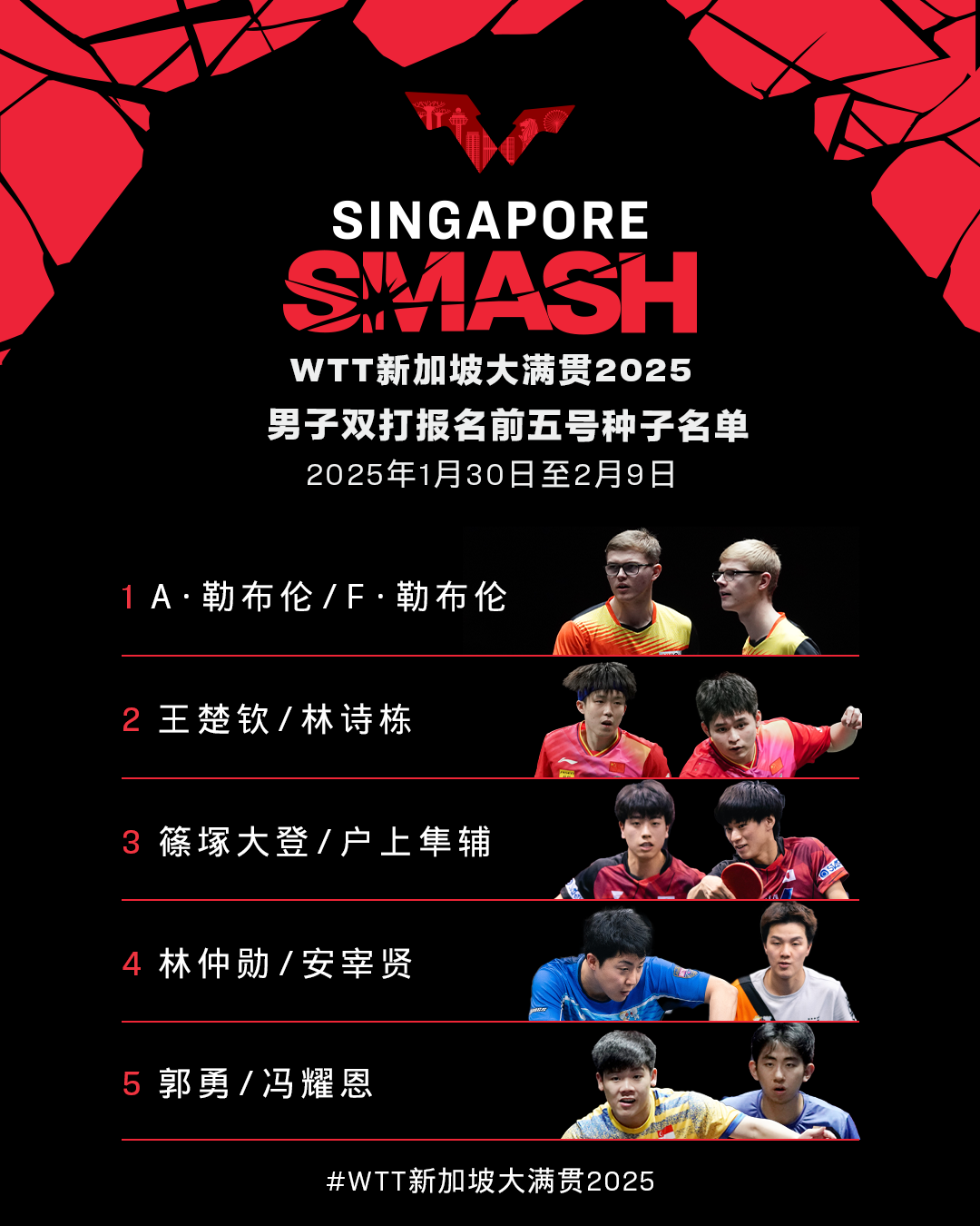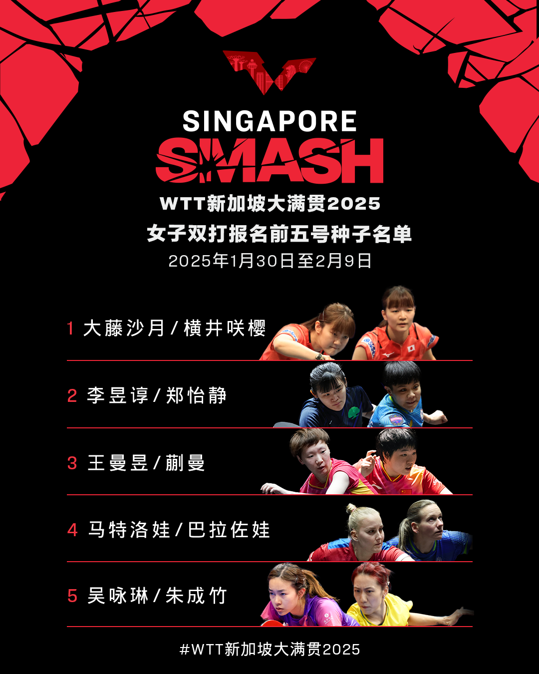 WTT新加坡大满贯1月30日开打 双打前五号种子名单→