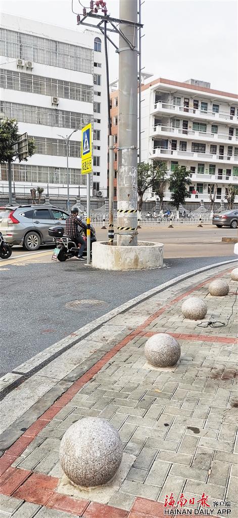 海口沙博路与南沙路交会口,非机动车道上立根电线杆添堵,还存隐患。