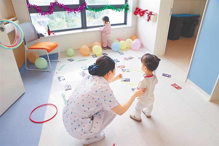 彩带、气球、套圈……温馨的环境中,两个孩子在医护人员的带领下尽情玩着游戏,欢歌笑语不断。