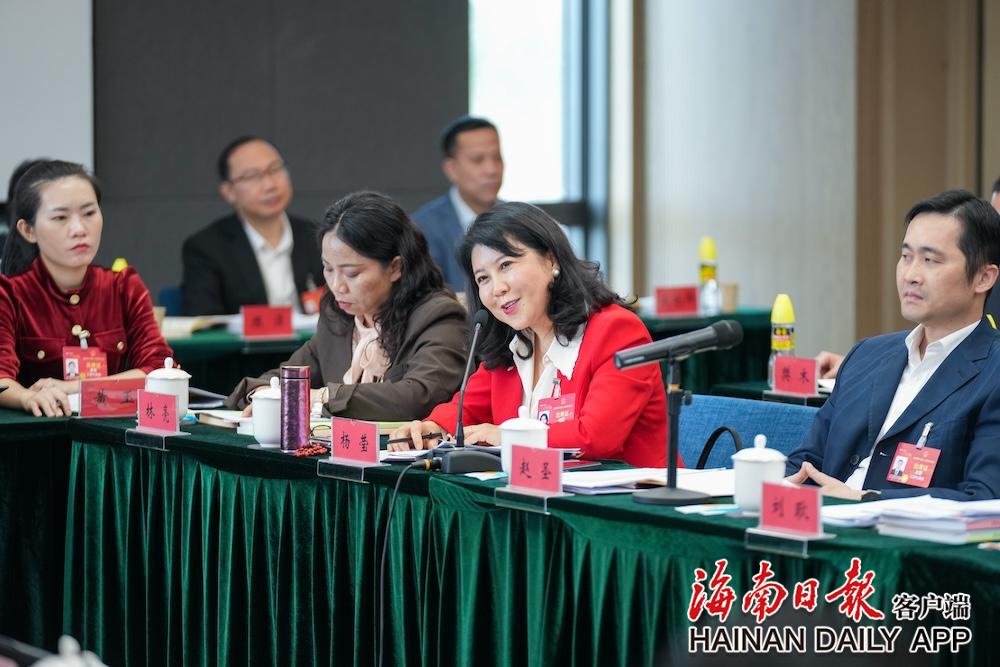 1月15日,省人大代表分组审议政府工作报告。图为省人大代表杨莹(右二)发言。海南日报全媒体记者 武威 摄