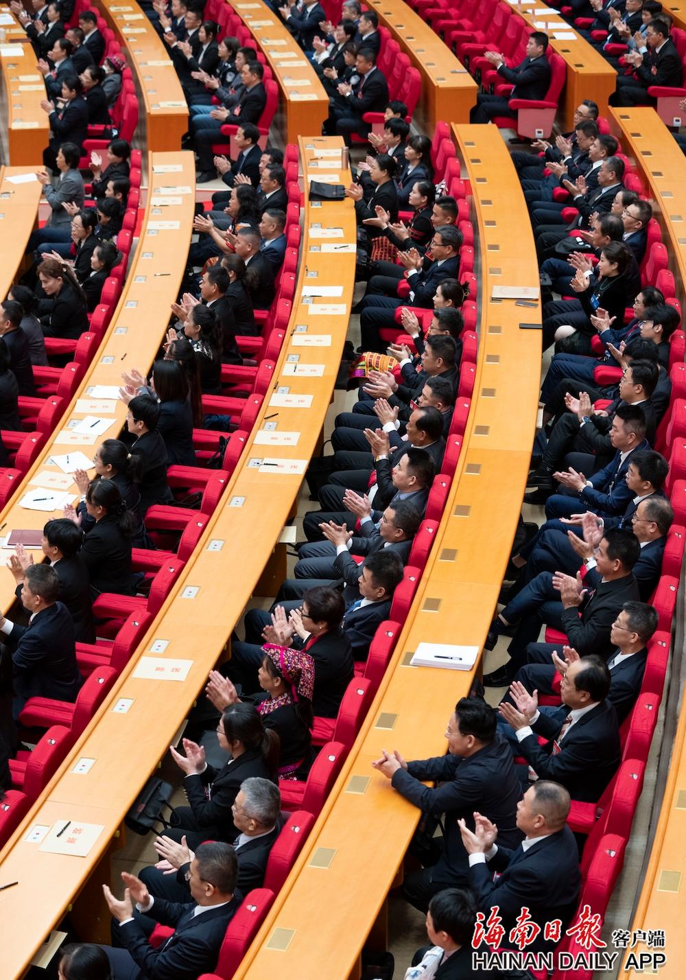 1月18日,省七届人大四次会议圆满完成各项议程在省人大会堂胜利闭幕。图为代表鼓掌通过有关决议。海南日报全媒体记者 王凯 摄