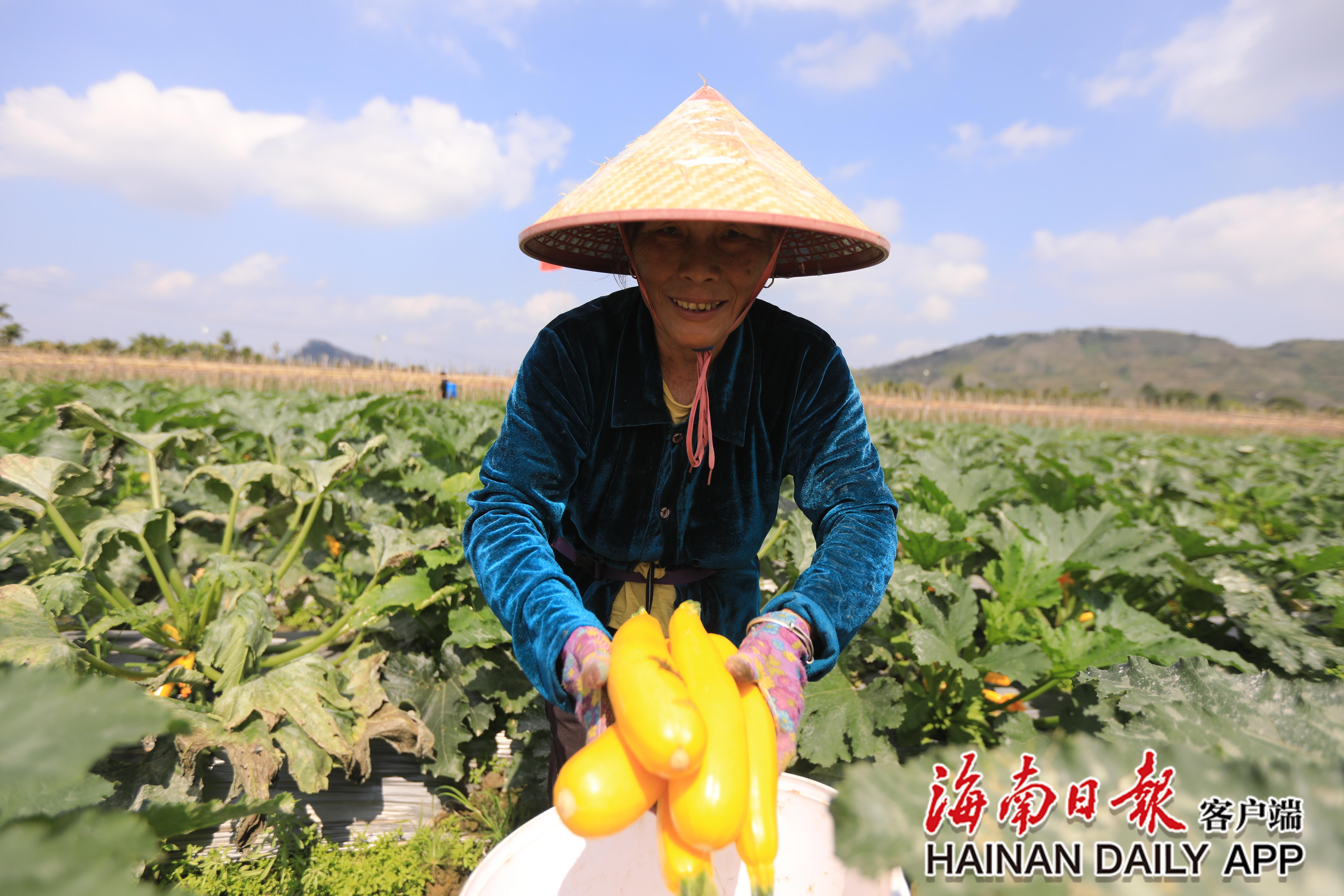 2月18日中午,定安县岭口镇群山村所属南雷洋的一片瓜菜地中,本地阿婆们正在一根根地采收成熟的西葫芦瓜。不过,和常见的绿色西葫芦瓜不同的是,这些瓜从表皮到瓜肉,都是黄澄澄的,连刚长出来的小瓜也是如此。