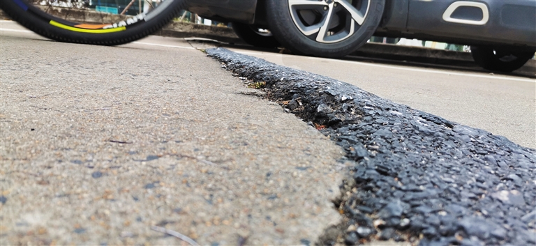 南海大道一处非机动车道路面被开挖后简单使用沥青回填,明显凸起。