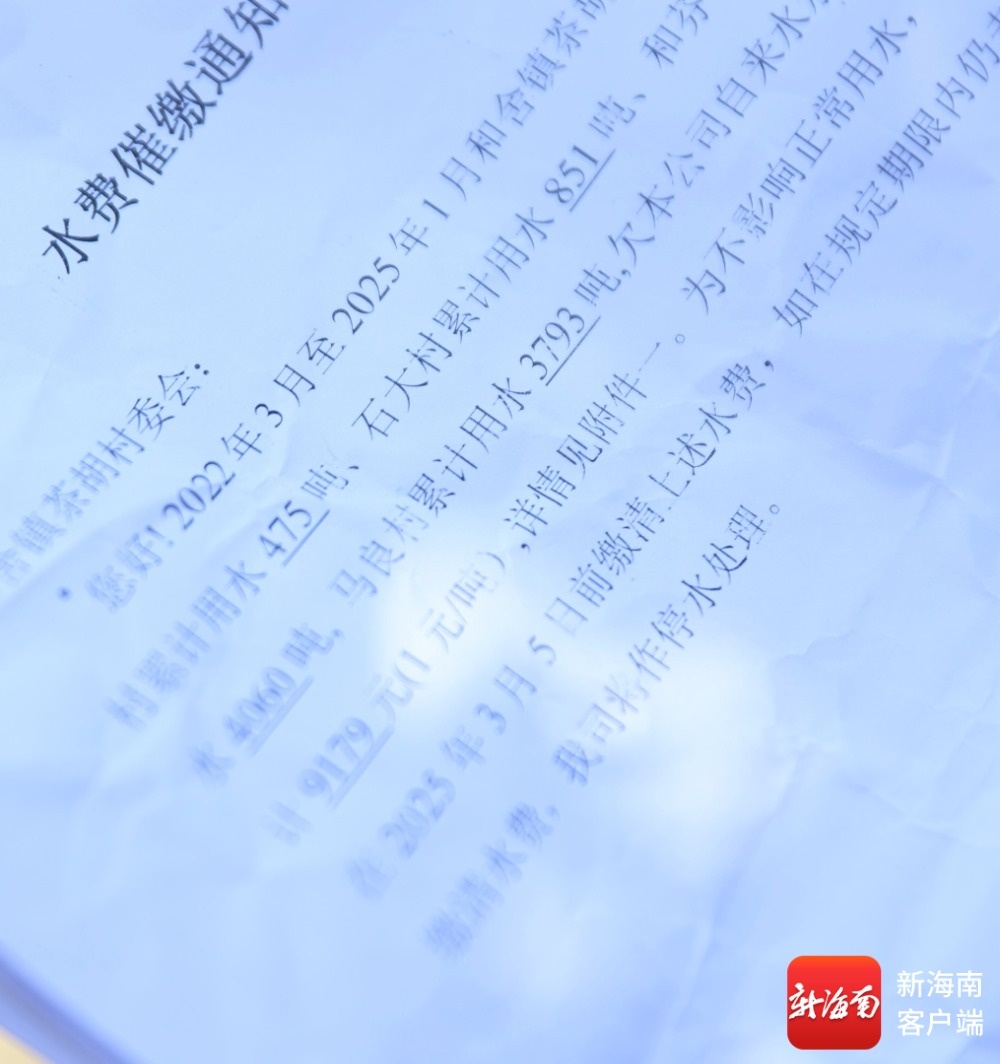 “这两天恢复了茶胡村小组自来水供应,但却是临时的。”临高县水务公司副总经理王少锋说,“自2021年开始给茶胡村小组供应自来水,截至目前都没有收到该村的水费,目前已经欠费1万多元,公司无奈之下暂停该村的自来水供应。”