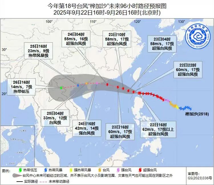 今年第18号台风“桦加沙”(超强台风级),22日16时中心位于北纬19.4度、东经121.4度,也就是在广东省湛江市东南方向约1160公里的海面上,中心附近最大风力17级以上(62米/秒)。