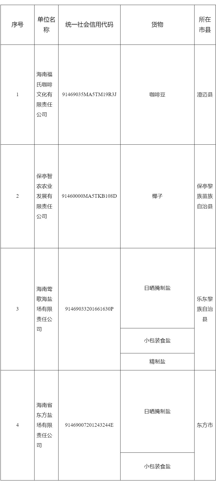 第一批企业(货物)为海南福氏咖啡文化有限责任公司(咖啡豆)、保亭智农农业发展有限责任公司(椰子)、海南莺歌海盐场有限责任公司(日晒腌制盐、小包装食盐、精制盐)、海南省东方盐场有限责任公司(日晒腌制盐、小包装食盐)。