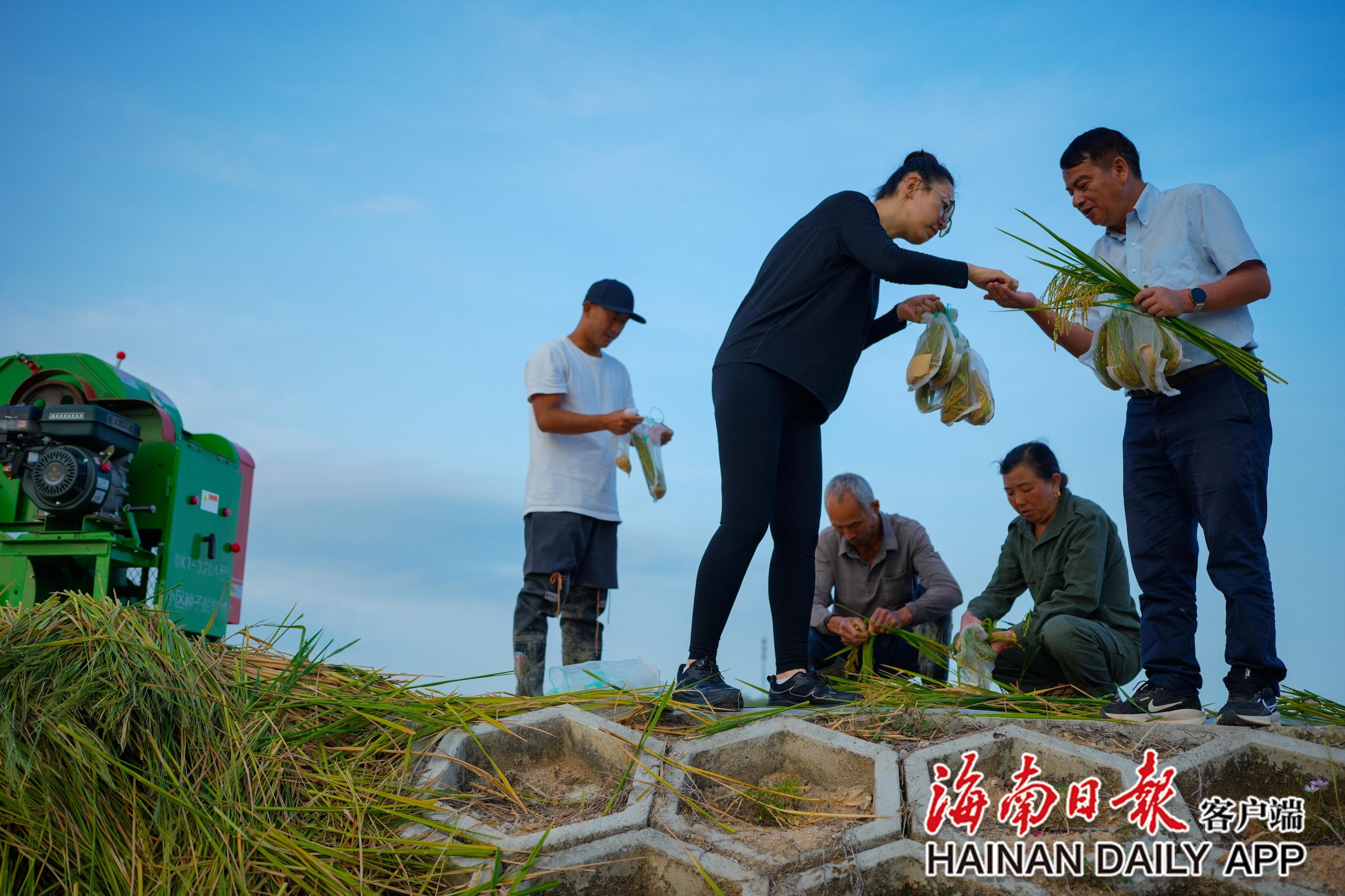 2025年3月30日,三亚的国家南繁科研育种基地迎来水稻收割季,钱前院士(右一)和科研人员对不同的水稻品种材料进行取样。